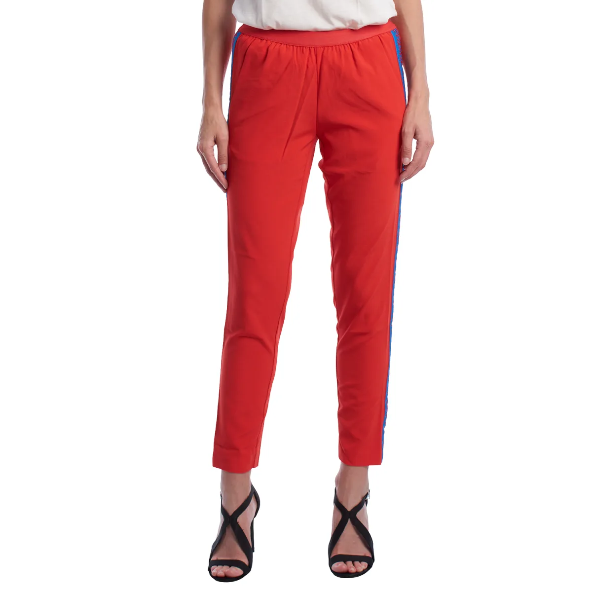 Sportieve broek met decoratieve band aan de zijkant.nn Dankzij het sportieve ontwerp combineert deze slim-fit broek een casual stijl met een geraffineerde touch. Het decoratieve zijdetail voegt dynamiek en visueel contrast toe, terwijl de elastische tailleband de hele dag comfort biedt.nn Detailsn - Soort kleding: Strakke broek in jogger-stijl.n - Materiaal: Lichtgewicht en vloeiende stof.n - Stijl: Casual en sportief met een moderne afwerking.n - Print: Decoratieve band aan de zijkanten.n - Taille: Elastiek.nn Perfect voor ontspannen urban outfits met een opvallende en comfortabele touch. Deze joggingbroek voor dames is ideaal voor overgangslooks of casual stijlen met stijl.n Samenstelling: 76% acetaat, 24% polyestern Onderhoud:nHandwas in koud water.n Geen bleekmiddel of bleekproducten gebruiken.n Niet in de droger drogen.