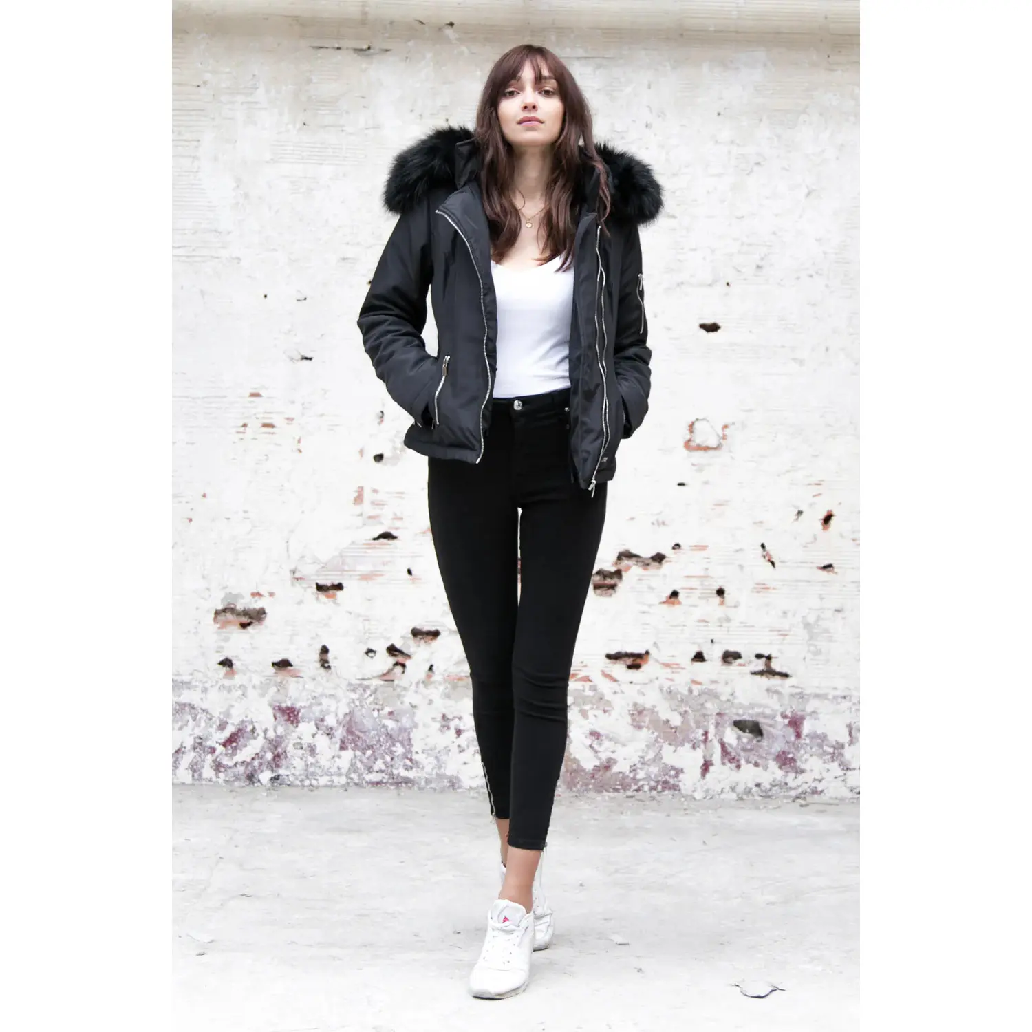 Jas Sixth June Dames dik, met (afneembare) capuchon van nepbont. Zeer strakke snit, dubbele rits, zijzakken met rits en een binnenkoord voor de taille. Zwart model met zwarte bont.