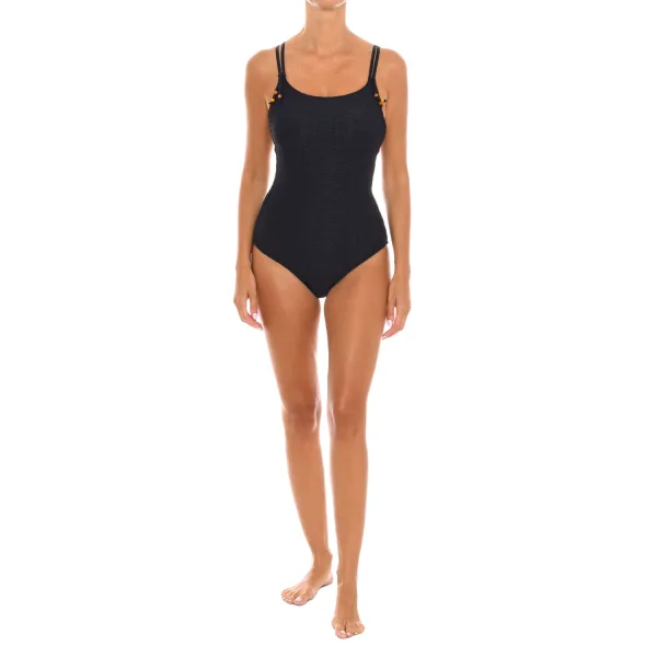 Damesbadpak met ronde hals EB0216B. Het heeft een ronde halslijn aan de voorkant, waardoor een vrouwelijk en elegant silhouet ontstaat. Inclusief cups om de buste te ondersteunen en te verbeteren. Volledig gevoerd. Het heeft verstelbare bandjes waarmee je de pasvorm en bedekking kunt aanpassen. De bandjes kunnen worden verwijderd om gekruist of recht gedragen te worden. Op de rug heeft het een V-uitsnijding, waardoor een deel van de rug zichtbaar is. Dit Teleno badpak is een aantrekkelijke en veelzijdige optie om te dragen op het strand, bij het zwembad of bij andere wateractiviteiten. Het elegante en vrouwelijke ontwerp maakt het een geschikt kledingstuk voor zowel een dag op het strand als voor meer formele evenementen of situaties. Samenstelling: Buitenkant: 91% Polyester, 9% Elastaan. Voering: 92% Polyester, 8% Elastaan. Cup: 100% Polyester Onderhoud: Handwas maximaal 30º. Geen droger gebruiken. Geen bleekmiddel gebruiken. Niet strijken. Niet chemisch reinigen. Niet uitknijpen.