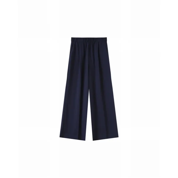 Rechte broek met wijde pijpen. Elastische tailleband halverwege de taille. Plooien en Italiaanse zakken aan de voorkant. Volledige lengte.Samenstelling : 70% viscose, 30% polyester