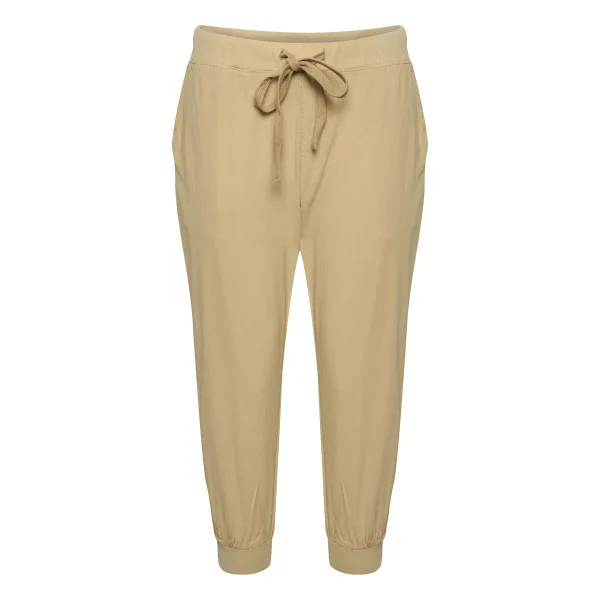 Deze damescapri's van Kaffe zijn gemaakt van 100% katoen. Ze hebben een slim fit en een elastische tailleband met een koord. De zandkleurige broek heeft zakken aan de voorkant en elastische boorden onderaan.