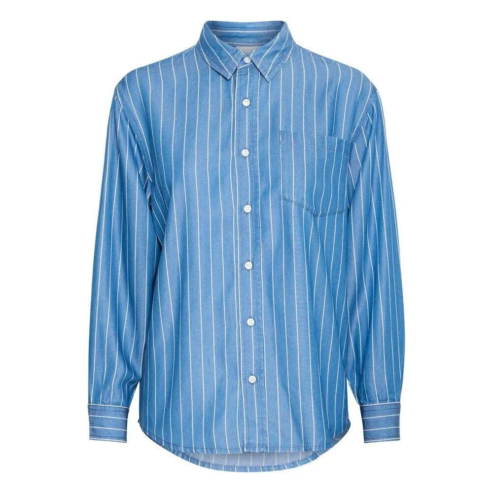 Blouse type: Klassieke blouse; Design: 1-knoops manchetten, Gevoerde zoom/rand, Rechte manchetten, Knop placket, Rugplooi, Ronde zoom, Borstzak; Type sluiting: Knoopsluiting; Materiaal: Denim; Motief: Gestreept; Kraag: Kentkraag; Details: Plooien; Extra's: All-over patroon, Vaste grip; Pasvorm: Losse pasvorm; Armlengte: Lange mouw; Lengte: Normale lengte