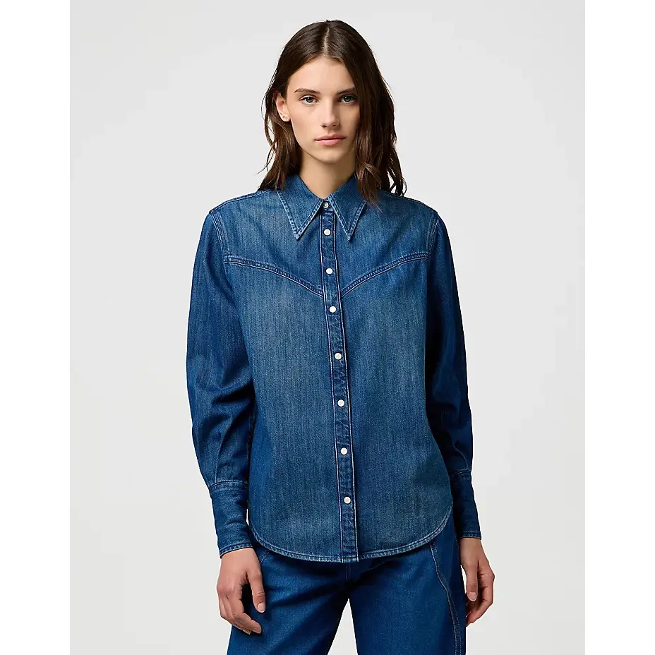 Dit denimblouse met inzetstuk is een zacht, flatterend en vrouwelijk model met authentieke western details. Deze denimblouse met inzetstuk en lange mouwen is een herinterpretatie van een Amerikaanse klassieker met een vrouwelijke touch. Ze is verrijkt met een western inzetstuk, een afgeronde zoom, drukknoopsluiting en western details ter ere van de oorsprong van Wrangler. Maak de look af met een totale denim outfit. Regular fit die gemakkelijk te dragen is, voor optimaal comfort. Materiaal is 100 % zachte en ademende katoen. De stof die voor dit kledingstuk is gebruikt, is 100 % regeneratieve katoen, geteeld op een manier die de gezondheid van de bodem, de biodiversiteit en het waterbeheer verbetert.