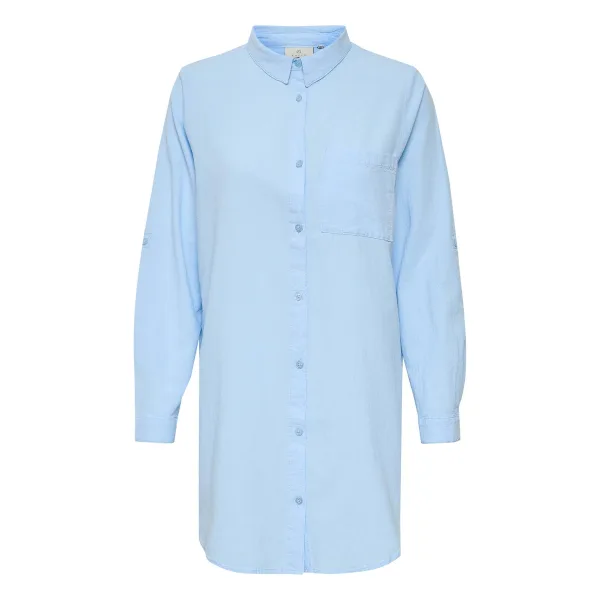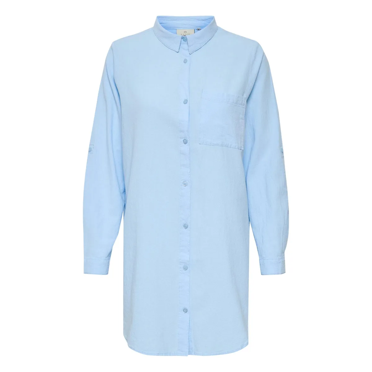 Deze lichtblauwe katoenen dames blouse van Kaffe is een basic voor dagen waarop je net iets gekleder voor de dag wilt komen, maar toch graag comfortabel blijft. Het lange, iets boxy model valt losjes om het lichaam, waardoor de blouse soepel om je heen valt. De klassieke kraag en knoopsluiting geven een nette uitstraling, terwijl de borstzak en rechte mouwen het ontwerp rustig en modern houden. Gemaakt van 100% katoen voelt de stof zacht aan op de huid en is deze blouse geschikt voor het hele seizoen.Kenmerken van de KAnaya blouse Lange blouse met boxy pasvorm voor een ontspannen silhouet Lichtblauwe kleur en effen design, makkelijk te combineren Gemaakt van 100% katoen voor een ademende en zachte touch Klassieke kraag en volledige knoopsluiting aan de voorkant Rechte lange mouwen met oprolfunctie voor twee draagopties Borstzak als subtiel detailVeelzijdig in je dagelijkse outfitsDe KAnaya blouse draag je los over een jeans voor een casual look of ingestopt in een nette broek voor een meer geklede outfit. Door de mouwen op te rollen wordt de blouse direct wat luchtiger, handig op een zonnige lentedag. Ook open als extra laag over een T-shirt is dit lange model prettig te dragen.Kaffe: Scandinavische eenvoudKaffe is een Deens modemerk dat bekend staat om toegankelijke collecties met een vrouwelijke uitstraling. De ontwerpen hebben vaak een rustige basis, met aandacht voor pasvorm en draagbaarheid. Daarmee biedt Kaffe kleding die goed aansluit op het dagelijks leven en gemakkelijk te stylen is met de rest van je garderobe.Een luchtige blouse die je garderobe een frisse, lichtblauwe tint geeft.
