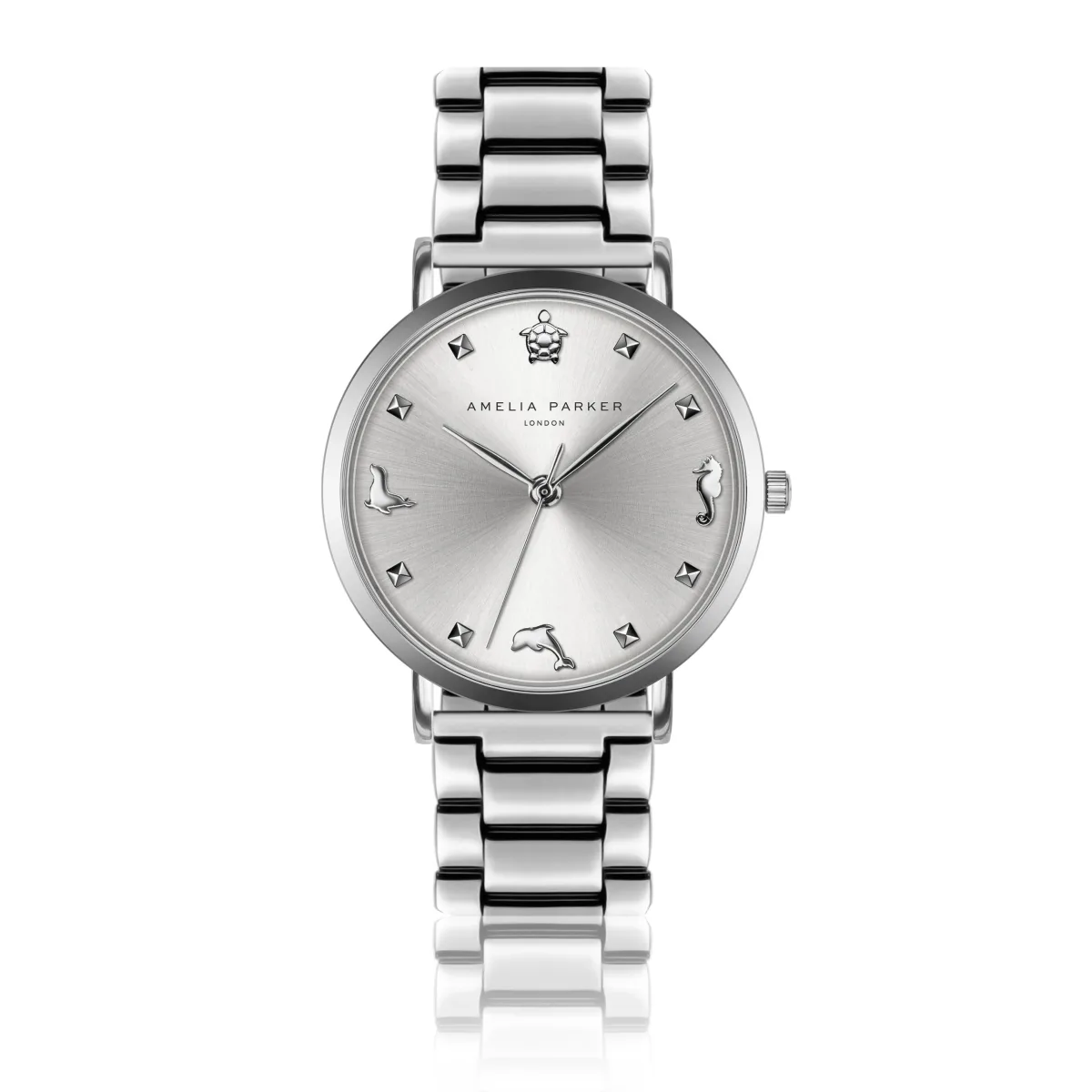 Dit exclusieve uurwerk is geïnspireerd op de oude bedelarmband en symboliseert geloof en verbondenheid. Het viert de beschermende krachten van de natuur en is versierd met een zeepaardje, een dolfijn, een zeehond enAmelia Parker's kenmerkende juweel, de tortue zee.Modelnaam: Bedel Silver LinkKastmaat mm: 36Materiaal kast: MetaalsamenstellingKleur kast: ZilverKleur kast: Ionische plating (IP)Armbandmaat mm: 18×18Materiaal band: Roestvrij staalKleur band: ZilverKleur wijzerplaat: Sunray zilverGlas: Gehard mineraalglasAchterkant kast: Roestvrij staalWaterbestendigheid: 3 ATM