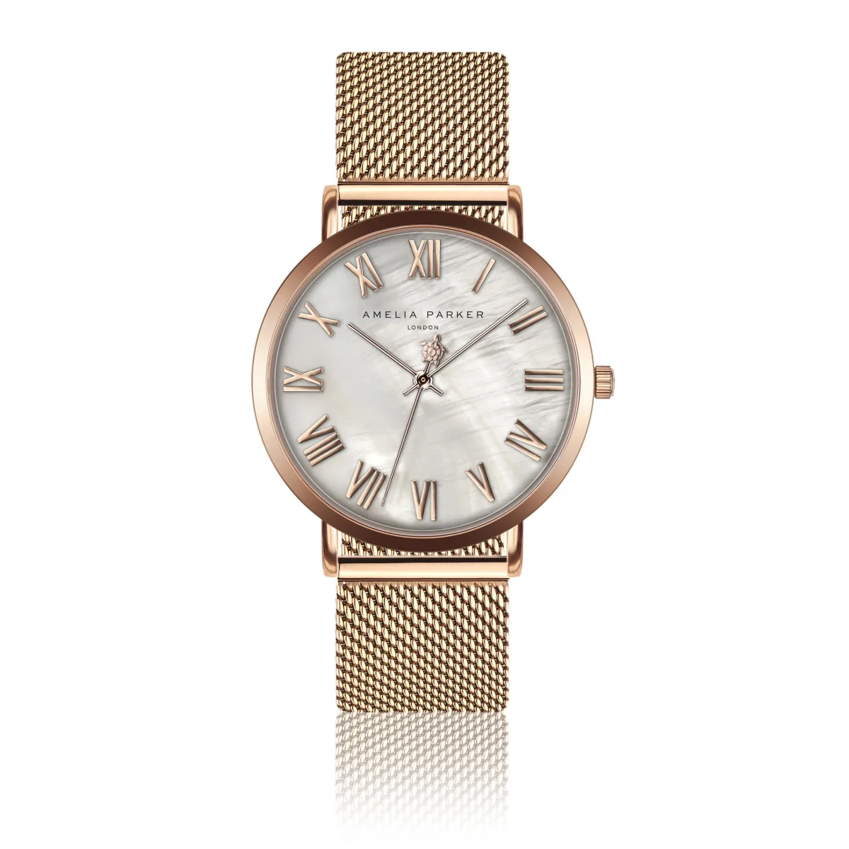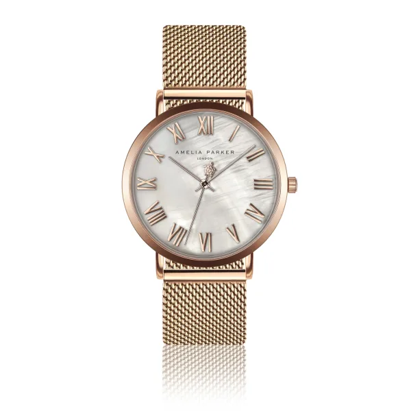 Met de klassieke combinatie van gouden Romeinse cijfers rose op een gestructureerde crème achtergrond en geaccentueerd door het iconische tortue zeejuweel Amelia Parker op de secondewijzer, voor Amelia Parker, viert dit horloge tijdloze charme.Modelnaam: Classique Rose goud MeshKastmaat mm: 36Materiaal kast: MetaalsamenstellingKleur kast: Goud rose Kleur kast: Ion-plating (IP)Armbandmaat mm: 18×18Materiaal band: Roestvrij staalKleur band: Goud rose Kleur wijzerplaat: ParelmoerGlas: Gehard mineraalglasAchterkant kast: Roestvrij staalWaterbestendigheid: 3 ATM