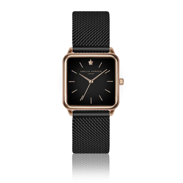 Een klein vierkant gitzwart gezicht met Amelia Parker 's kenmerkende zee tortue juweel in goud rose zorgt voor een heerlijk onbevreesd statement. Dit stuk is geïnspireerd op de zachte lijnen en vormen waar de kustvilla's van Cayman de wilde Caribische zee ontmoeten.Modelnaam: Night Plaza Black Mesh Kastmaat mm: 28Materiaal kast: MetaalsamenstellingKleur kast: Goud rose Plating kast: Ionische plating (IP)Armbandmaat mm: 18×18Materiaal band: Roestvrij staalKleur band: ZwartKleur wijzerplaat: Zon zwartGlas: Gehard mineraalglasAchterkant kast: Roestvrij staalWaterbestendigheid: 3 ATM