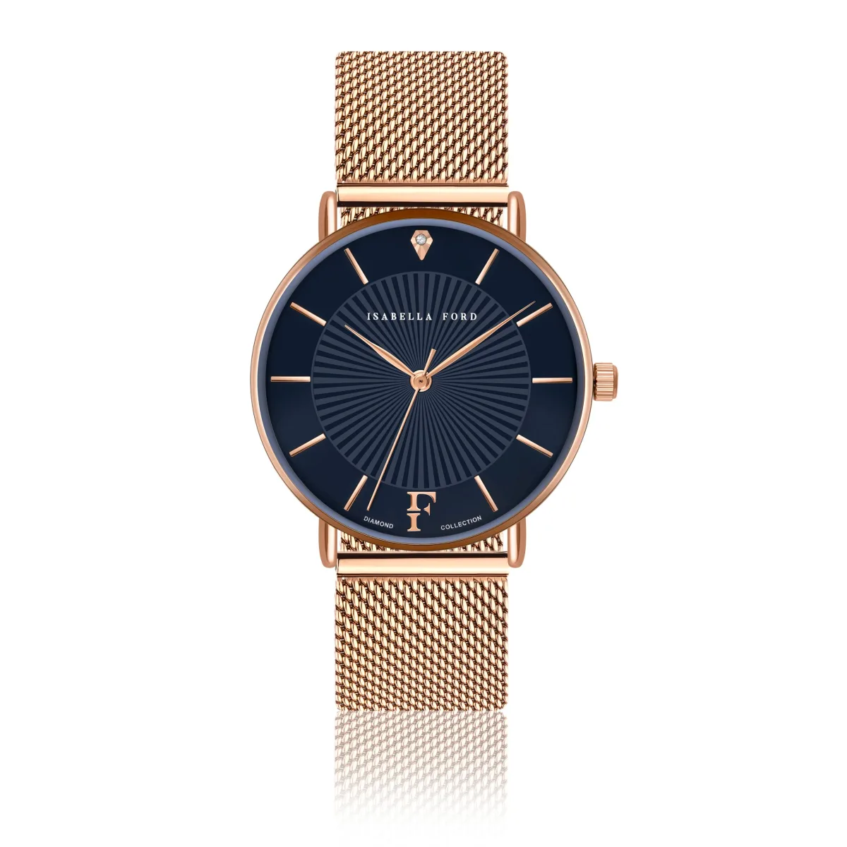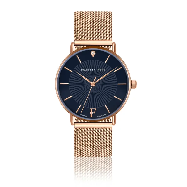 Isabella Ford presenteert een van de drie echte diamanten dag- en nachtklokken, elk met zijn eigen onweerstaanbare look. Een prachtig geraffineerd ontwerp, Florence is opgedragen aan slimme vrouwen die houden van de eenvoud van verfijnde, tijdloze luxe.Modelnaam: Florence Rose Gold MeshKastmaat mm: 36Kastmateriaal: MetaalsamenstellingKleur kast: Goud rose Kastbeplating: Ion-plating (IP)Armbandmaat mm: 18×18Materiaal band: Roestvrij staalKleur band: Goud rose Kleur wijzerplaat: Marine blauwGlas: Gehard mineraal kristalDiamant details: Cut: Single; Clarity: I-3; Kleur: Upper crystal;Case back: Roestvrij staalWaterbestendigheid: 3 ATM