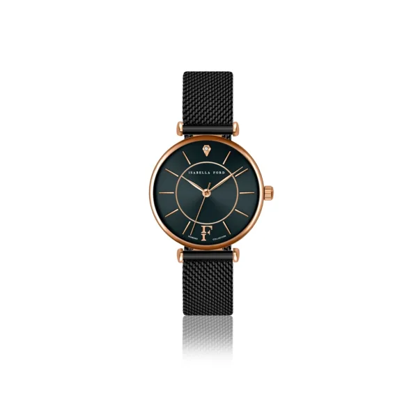 Met een elegante sunray zwarte wijzerplaat perfect aangevuld met levendige gouden details rose, is dit luxe uurwerkIsabella Ford 's eerbetoon aan dynamische tweekleurige accessoires en verfijnde functionaliteit. Opgedragen aan chique vrouwen die van design houden, schittert een prachtige met de hand aangebrachte echte diamant om middernacht.Modelnaam: Portia Black MeshKastmaat mm: 32Kastmateriaal: MetaalsamenstellingKastkleur: Goud rose Case Plating: Ion-plating (IP)Armbandmaat mm: 14×14Armbandmateriaal: Roestvrij StaalArmbandkleur: ZwartWijzerplaat Kleur: Zwart SunrayGlas: Gehard Mineraal KristalDiamant Details: Cut: Single; Clarity: I-3; Kleur: Upper crystal;Case back: Roestvrij staalWaterbestendigheid: 3 ATM