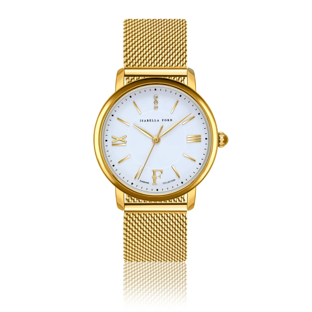 De luxe Selene vanIsabella Ford is ontworpen voor vrouwen die van details houden. Drie echte diamanten op het twaalfde uur worden prachtig uitgebalanceerd door twee grote, slanke gouden Romeinse cijfers en de iconische Isabella Ford. Een zuiver witte wijzerplaat draagt bij aan zijn elegante en ingetogen uitstraling. Modelnaam: Selene Goud MeshKastmaat mm: 36Kastmateriaal: MetaalsamenstellingKleur kast: GoudKleur kast: Ion-plating (IP)Armbandmaat mm: 18X18Armbandmateriaal: Roestvrij staalArmbandkleur: GoudKleur wijzerplaat: WitGlas: Gehard Mineraal KristalDiamant Details: Cut: Single; Clarity: I-3; Kleur: Upper crystal;Case back: Roestvrij staalWaterbestendigheid: 3 ATM