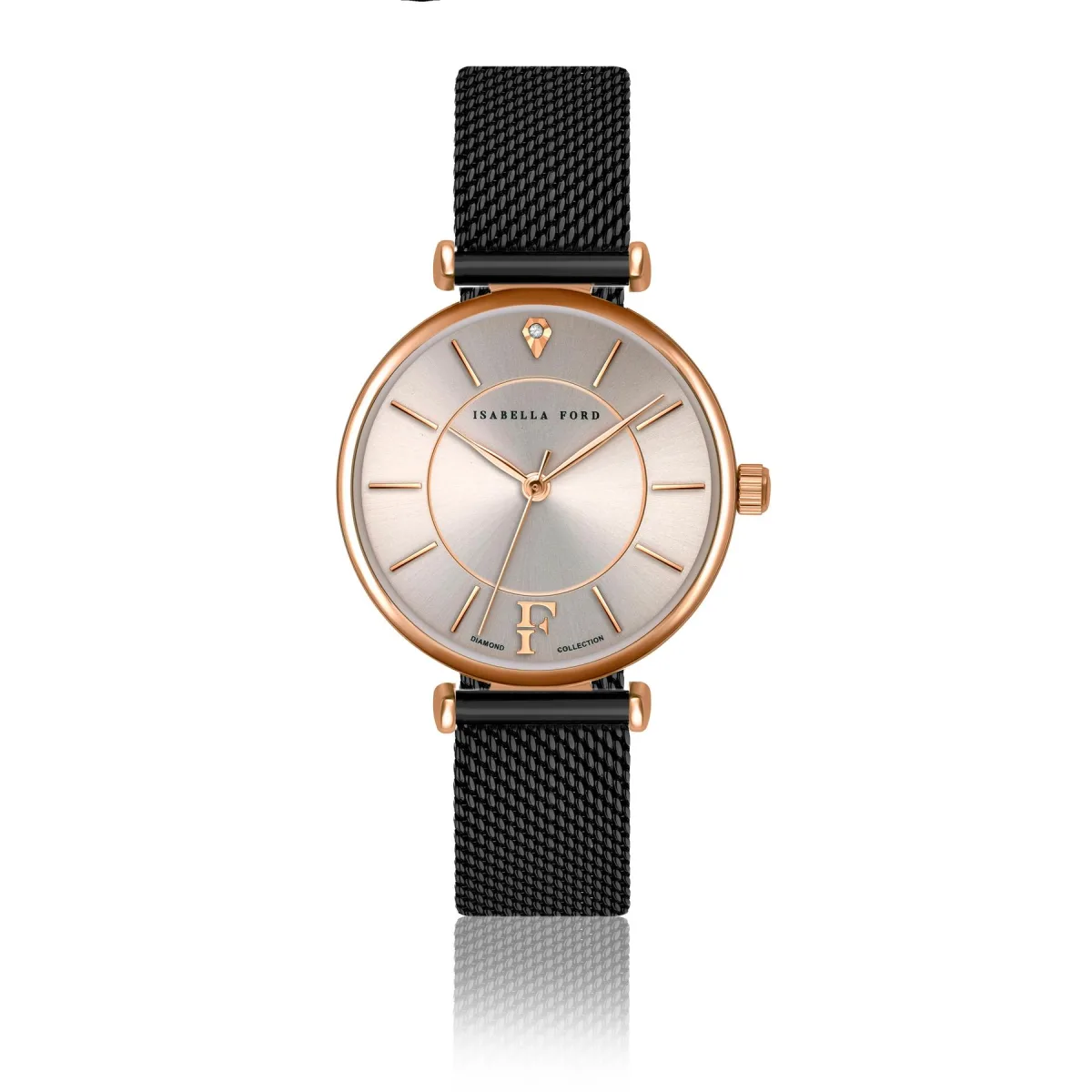Volledig gemaakt van goud rose, is dit luxe uurwerkIsabella Ford 's eerbetoon aan onberispelijke stijl en verfijnde functionaliteit. Het is opgedragen aan vrouwen die superieur design herkennen als ze het zien. Met minimalistische, ultradunne uurmarkeringen en wijzers, en een onmiddellijk herkenbaar reliëf F insignia Isabella Ford, alles in goud rose mute, een prachtige met de hand aangebrachte echte diamant schittert op het middernachtelijk uur.Modelnaam: Sophia Black MeshKastmaat mm: 32Materiaal kast: Metaal samenstellingKleur kast: Goud rose Kast plating: Ion-plating (IP)Armbandmaat mm: 14×14Materiaal band: Roestvrij staalKleur band: ZwartKleur wijzerplaat: Goud rose zonGlas: Gehard mineraal kristalDiamant details: Cut: Single; Clarity: I-3; Kleur: Upper crystal;Case back: Roestvrij staalWaterbestendigheid: 3 ATM