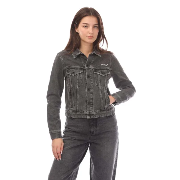 Dames Off White Diagonal Regular Denim Jacket in donkergrijs - wit.- Klassieke kraag.- Volledige knopenlijst met metalen merkschakels.- Lange mouwen met manchetten met knopen.- Off-White logo gedrukt op linkerborst.- Diagonale graphic op achterkant.- Borstzakken met knoopsluiting.- Paspelzakken aan voorkant.- Lusjes in taille aan achterkant.- Off-White™ label in taille aan achterkant.- Hoofdmateriaal: 100% Katoen. Voering: 65% Polyester 35% Katoen. Machinewasbaar.- Ref: OWYE0120010701
