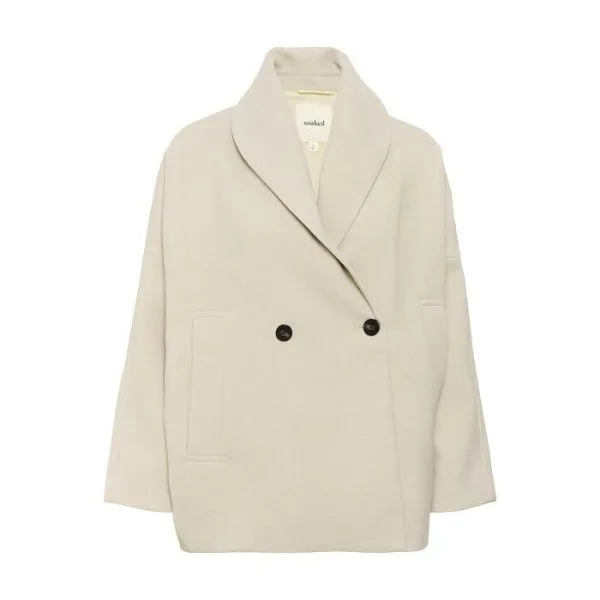 Boxy jas met brede sjaalkraag, double-breasted voorkant en verlaagde schouders. Los silhouet, lange mouwen en strakke lijnen.
