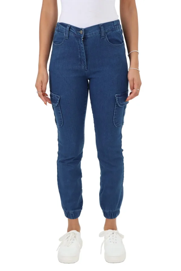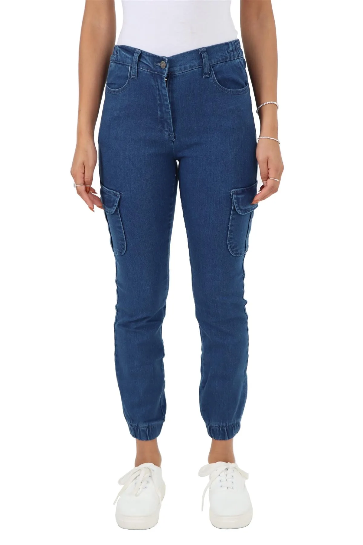 Damesjeans met elastische taille en zelfboeien in blauw Prijzen