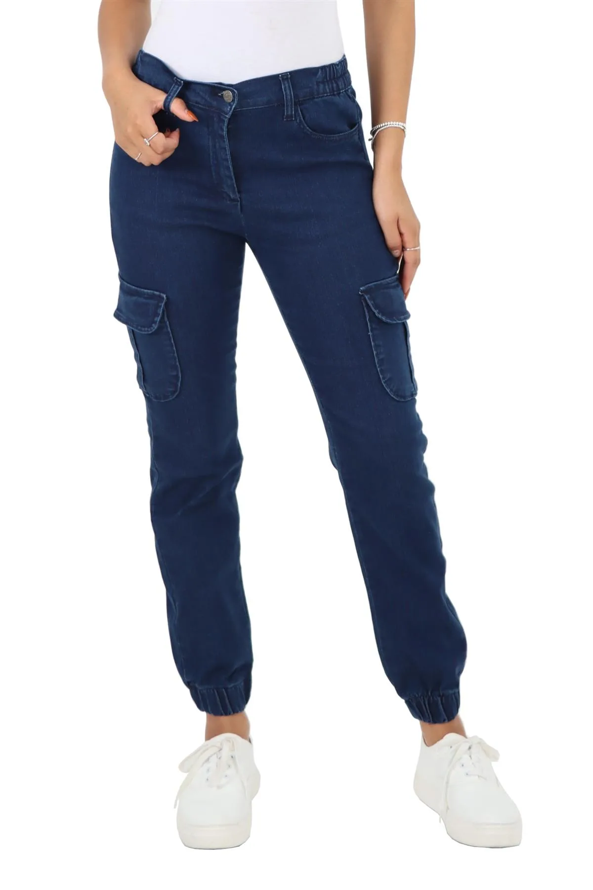 Damesjeans met elastische taille en zelfboeien in donkere stonewash