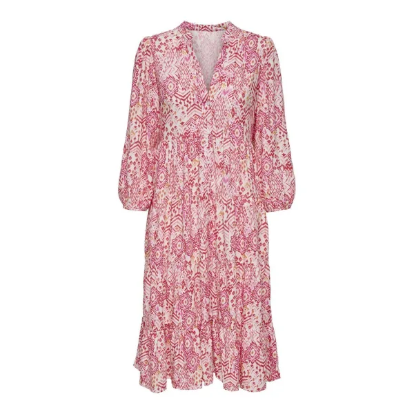 Geef je alledaagse look eenvoudig een frisse update met deze ONLY midi jurk Onlmilana in roze en creme. De jurk heeft een all over print en een middel lange lengte die net over de knie valt. De soepele geweven stof voelt luchtig aan op de huid, wat prettig is op mildere dagen in de lente en tijdens overgangsweer. De V-hals en knoopsluiting aan de voorzijde geven een vrouwelijke uitstraling, terwijl de rechte 7/8 mouwen zorgen voor een ontspannen, maar verzorgde look.Eigenschappen van de Onlmilana jurk Middel lange midi jurk, ideaal voor dagelijks gebruik Kleur roze/creme met all over print Gemaakt van 100% viscose, voelt soepel en licht aan Geweven kwaliteit voor een nette, licht luchtige fit V-hals en knoopsluiting aan de voorkant Rechte 7/8 mouwen, comfortabel en passend bij meerdere seizoenen Zonder zakken voor een gladde, rustige vorm Valt normaal volgens het maatadvies Onderhoud: wasbaar op dertig graden, drogen op lage temperatuur, lauw strijkbaarVoor je dagelijkse momentenDeze jurk komt uit de daily collectie en is geschikt voor allerlei gelegenheden door de week. Draag de Onlmilana met sneakers voor een relaxte dag of met nette laarsjes als je iets gekleder voor de dag wilt komen.ONLY, eigentijdse stijl voor elke dagONLY staat bekend om modieuze items met een toegankelijke prijs en een eigentijdse pasvorm. De collecties sluiten goed aan op de trends van nu, maar blijven draagbaar voor iedere dag. Zo vul je je garderobe eenvoudig aan met kleding die je vaak uit de kast pakt.Geschikt wanneer je een luchtige midi jurk zoekt die je zonder nadenken aantrekt.