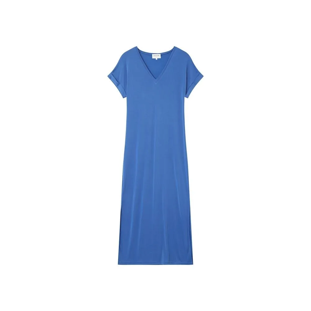 Lange jurk met V-hals. Korte mouwen met revers. Split opzij. Casual stijl. Samenstelling : 70% MODAL,30% Polyester