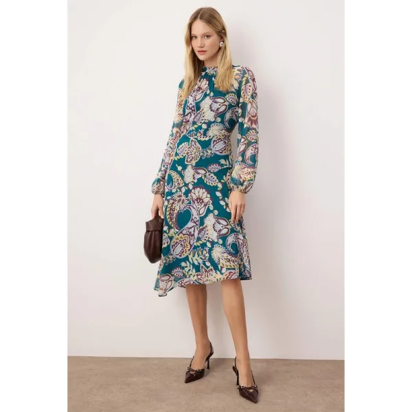 Damesjurk in groene paisleyprint, midi-lengte, casual A-lijn Prijzen