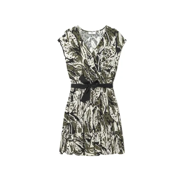Deze jurk met jungleprint zal perfect zijn voor de mooie dagen!Vrouwelijk met zijn riem die uw silhouet zal benadrukken, zal het u begeleiden in al uw gelegenheden!V-halsKorte mouwen Afneembare zwarte riemKnoop om de halslijn te sluiten100% VISCOSE