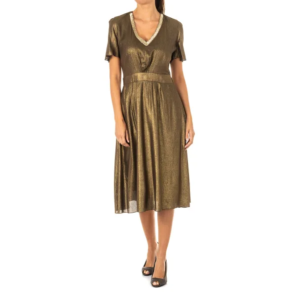 Jurk met korte mouwen, origineel ontwerp. Bruine kleur V-hals, versierd met strassteentjes. Mouwen tot overslag. Ritssluiting aan de zijkant. Binnenvoering van gaas. Naden in toon zichtbaar. Samenstelling: 100% viscose Wasvoorschriften: - Maximaal wassen op 40ºC. - Strijken op gemiddelde temperatuur, max. 110 ° C. - Droger mag gebruikt worden. - Geen bleekmiddel gebruiken. - Kan niet chemisch gereinigd worden. Maat Europees ontwerp 1 XS 2 S 3 M 4 L 5 XL 6 XXL Samenstelling: 100% viscose Onderhoud: - Wassen op maximaal 40ºC. - Strijken op gemiddelde temperatuur, max. 110ºC. - Je kunt een droger gebruiken. - Geen bleekmiddel gebruiken. - Kan niet chemisch gereinigd worden.