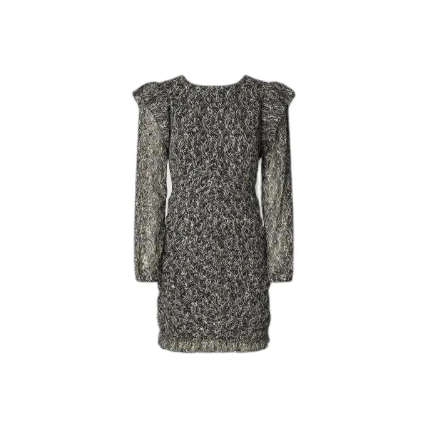 KORTE JURK MET LANGE MOUWEN EN VOLANT, PLOOIEN BIJ DE KOL, PINS OP HEUPHOOGTE. VERGADERINGEN IN HET CENTRUM VAN DE ROK EN EEN KLEIN VOLANT OP DE RAND.