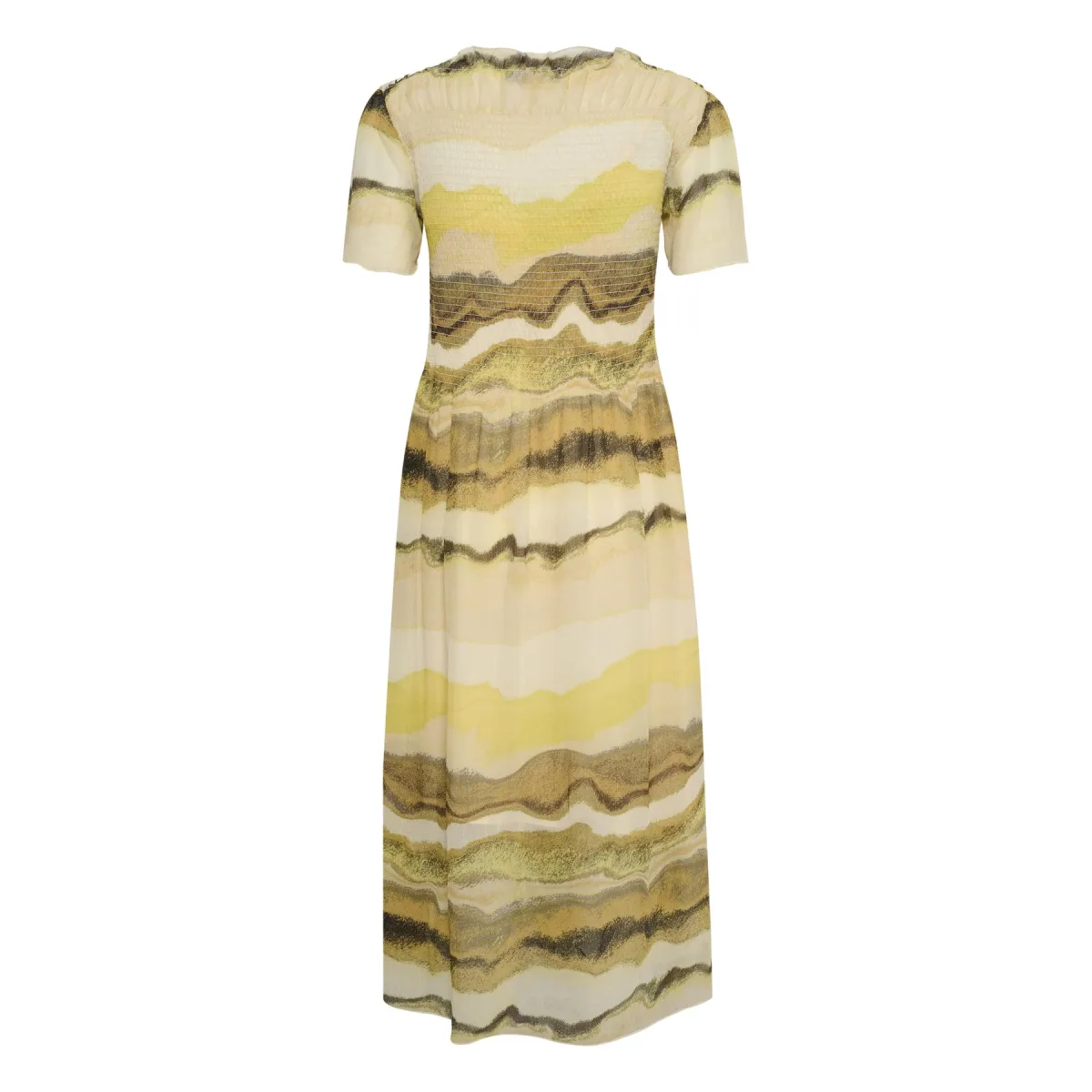 Lange jurk met korte mouwen, ronde hals en smokwerk op de borst en rug. De jurk heeft een normale pasvorm. Maat en lengte :Pasvorm: Slank modelLengte: Totale lengteLengte: 98 cm komt overeen met maat LSamenstelling: 100% PolyesterVoering: 100% Polyester