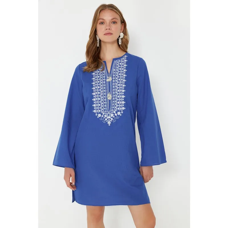 Damesjurken in blauw effen kleuren lange losse stijl
