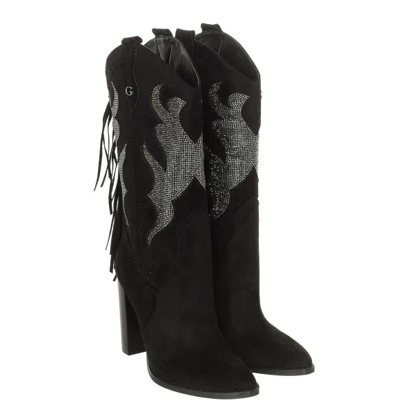 Laarzen met hak. Afgewerkt met suède. Spitse neus. Schacht met strassteentjes en franjes aan de achterkant. Sjabloon aangepast door het merk. Antislip zool. Naden in toon zichtbaar. Afmetingen: Schacht: 27cm - Hak: 10cm Samenstelling: Buitenkant: Synthetisch; Binnenkant: Leer; Zool: Synthetisch, Textiel Onderhoud: Reinigen met een natte doek.