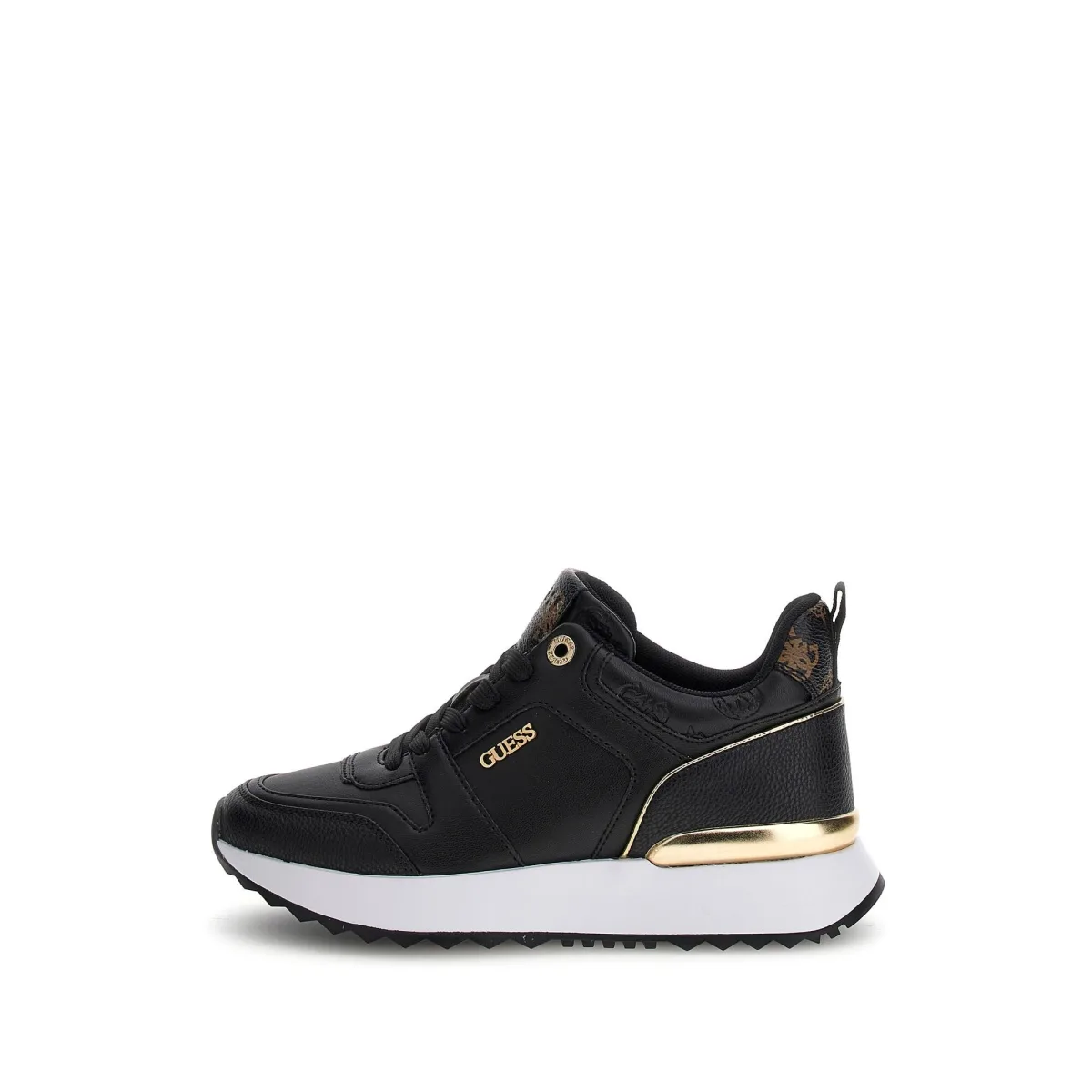 Guess damessneakers, goud 4G, zwart synthetisch. Authentieke Guess merkschoen – streetwear/sportswear design van Guess – Guess damesmode, perfect voor dagelijks gebruik – deze zwarte Guess sneakers passen perfect bij de rest van je garderobe – comfortabel synthetisch materiaal – klassieke veters – goud 4G – synthetisch.