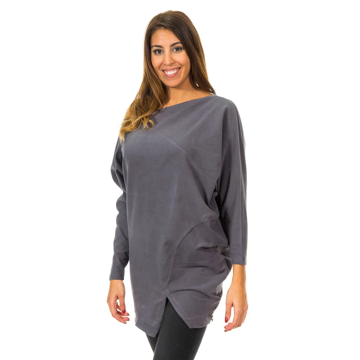Trui met lange mouwen. Vleermuismouwen. Boothals met geribde afwerking. Merknaam in metaal aan de onderkant. Onderkant met asymmetrische snit en opening aan de voorkant. Naden in toon zichtbaar. Samenstelling: 95% Katoen, 5% Elastaan Onderhoud: - Maximaal wassen op 40ºC. - Strijken op gemiddelde temperatuur, max. 110ºC. - Kan in de droger. - Geen bleekmiddel gebruiken. - Kan niet chemisch gereinigd worden.
