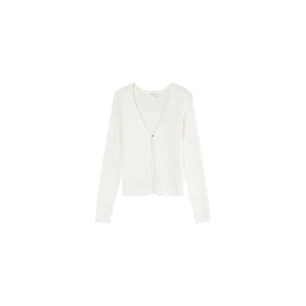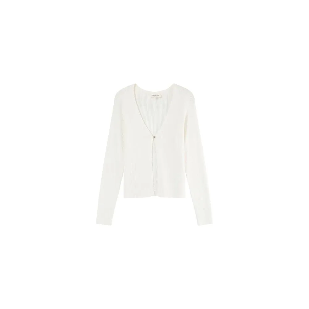 Vest met V-hals. Ribboord in een fijn breisel. Knoopsluiting aan de voorkant. Lange mouwen. Recht model. Samenstelling : 72% viscose,28% polyester