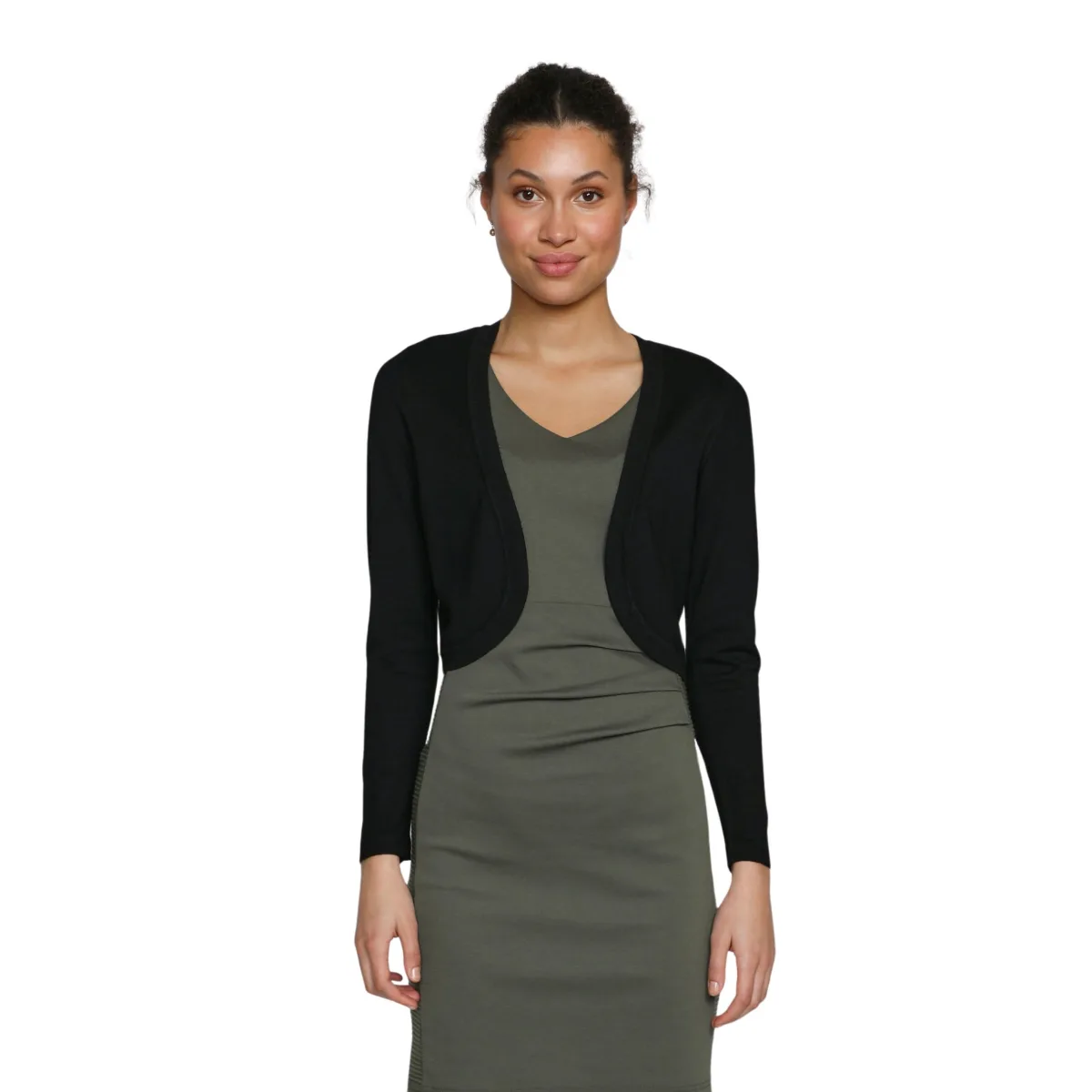 De KAastrid bolero heeft een eenvoudige, veelzijdige stijl die je bij elke outfit kunt combineren. Hij valt in de taille en heeft een slanke pasvorm. De bolero heeft lange mouwen en is open aan de voorkant met afgeronde randen.Snit en materiaal:Pasvorm: Regular fitLengte: 44 cm komt overeen met maat MSamenstelling: 80% viscose, 20% polyester Nylon