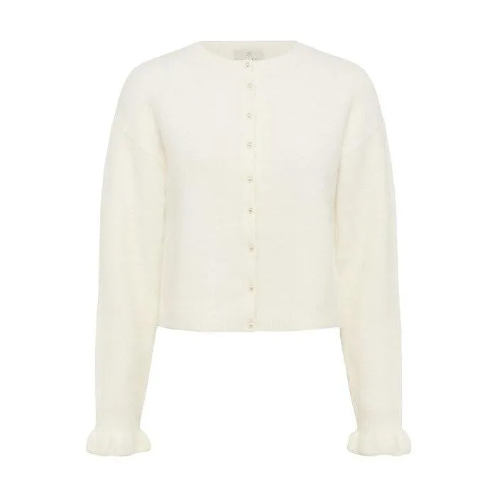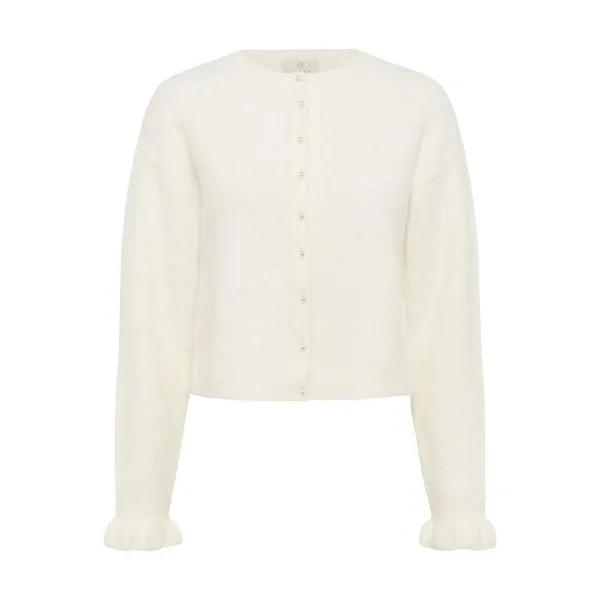 Cardigan met parelknopen aan de voorkant, zachte textuur, rechte pasvorm en ronde halslijn. Lange mouwen met subtiel uitlopende manchetten.