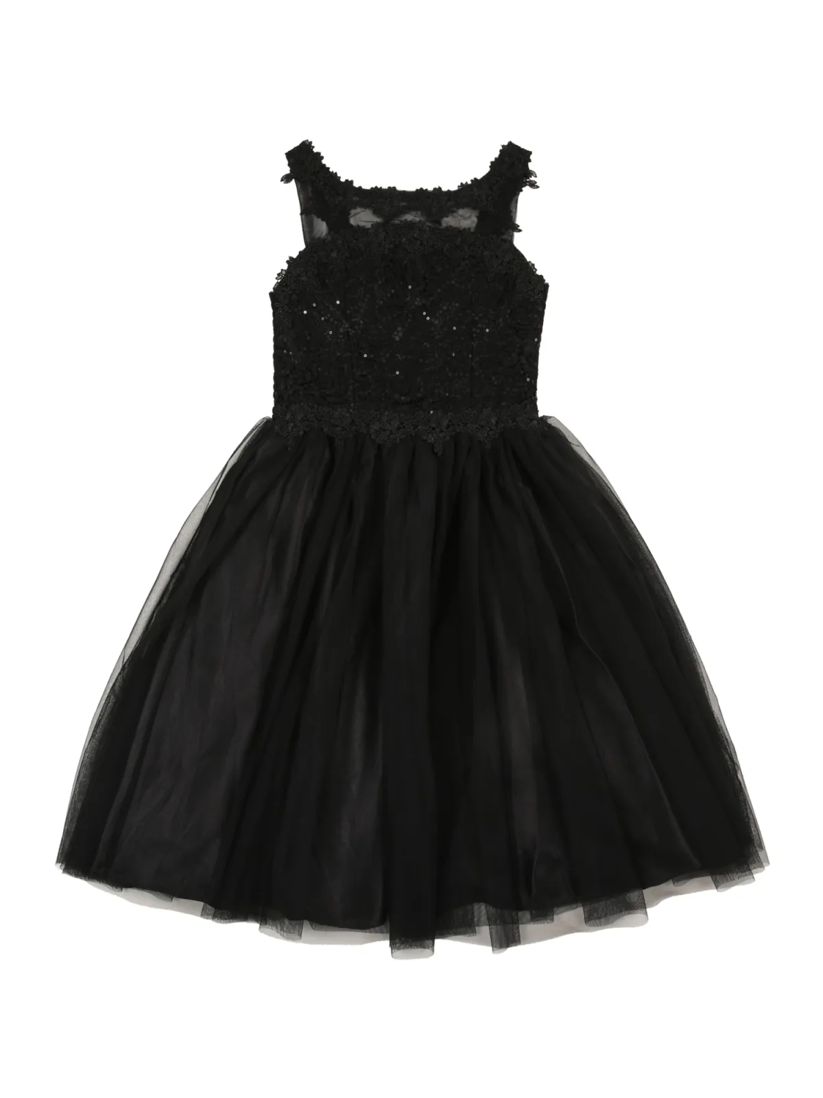 Design: Met onderjurk, Open randen, Rug rits, Deelnaden; Type sluiting: Ritssluiting; Materiaal: Tule; Halstype: Ronde hals; Motief: Effen; Soort bandjes: Normale bandjes; Details: Pailletten, Kant, Gedrapeerd; Extra's: Glitterend, Licht transparant, Op staal naden, Met textuur; Lengte: 3/4 lengte; Pasvorm: Normale pasvorm; Armlengte: Mouwloos