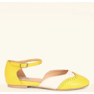 ''Shoe love is true love!'' Je kunt niet anders dan verliefd worden op deze schattige platte ballerina's! Uitgevoerd in geel en crèmekleurig imitatie leder met brogue details en een verstelbaar enkelbandje. * Ballerina * Imitatie leder * Verstelbaar enkelbandje * Comfortabel voetbed * Anti-slip zool