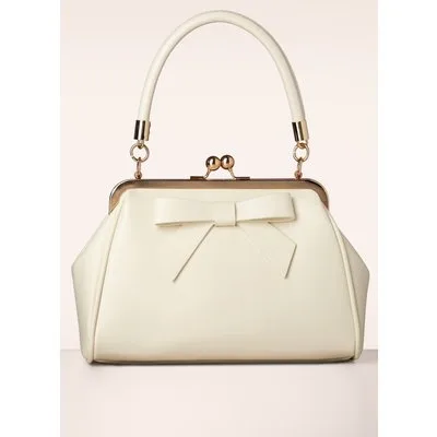 ''Just a daydream away!'' Dit kleine zusje van de klassieke American Vintage bag heeft een opvallende goudkleurige metalen klipsluiting voor een echte vintage look en is uitgevoerd in crèmekleurig mat imitatie leder afgewerkt met een schattige strik. * Small sized * Klipsluiting * Binnenvak met 3 extra vakjes, waarvan 1 met rits * Afneembaar hengsel * Kan crossbody gedragen worden * Volledig gevoerd * Groot genoeg voor je telefoon, sleutels, en een kleine portemonnee