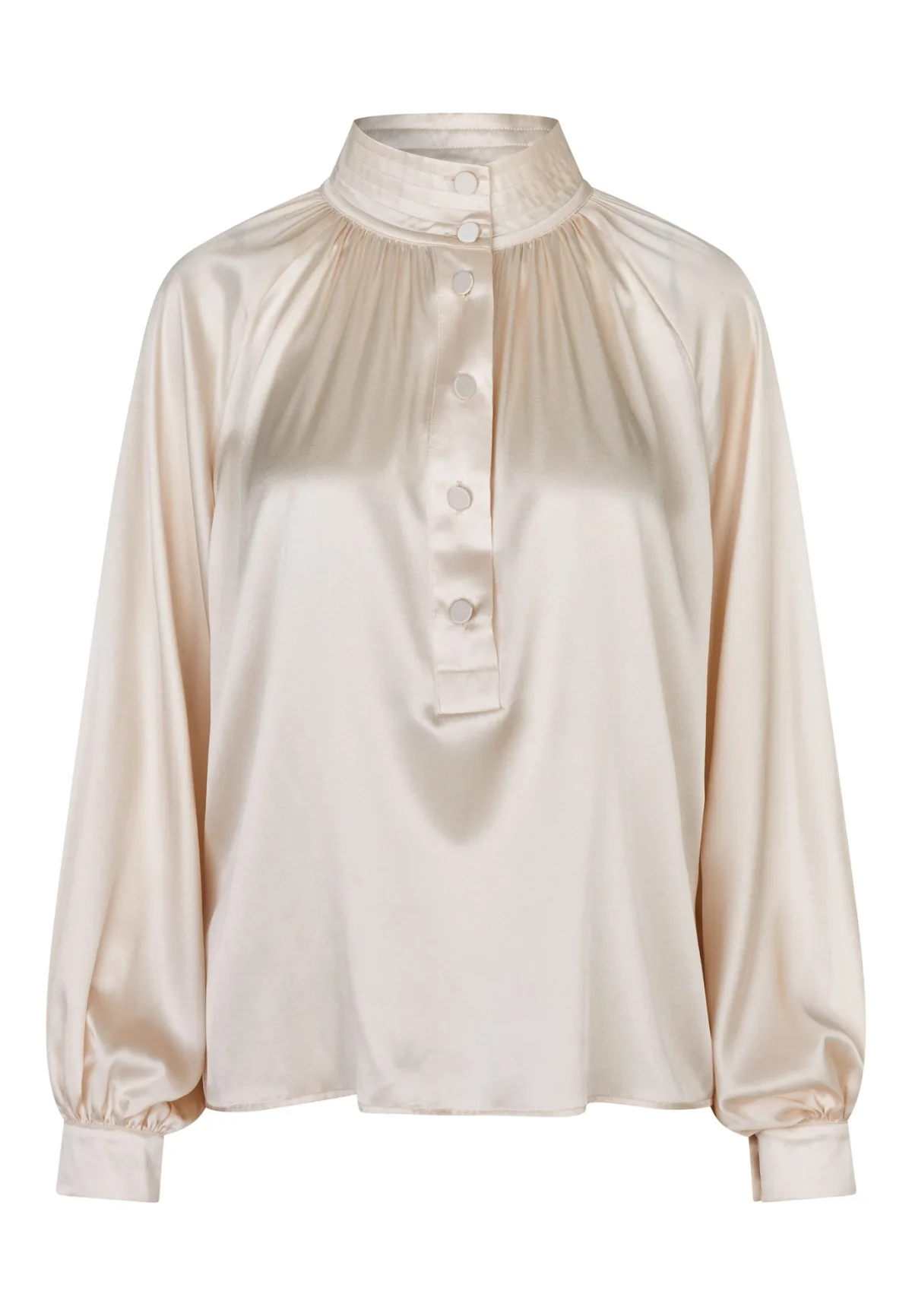Blouse type: Wijde blouse; Design: Knop placket, Pofmouwen; Type sluiting: Knoopsluiting; Materiaal: Zijde; Motief: Effen; Kraag: Opstaande kraag; Details: Gedrapeerd; Extra's: Op staal naden, Voelt aan als zijde; Pasvorm: Losse pasvorm; Armlengte: Lange mouw; Lengte: Normale lengte
