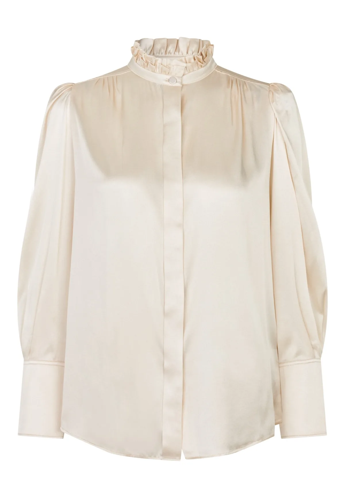Blouse type: Klassieke blouse; Design: Gevoerde zoom/rand, Verborgen knop placket; Materiaal: Zijde; Motief: Effen; Kraag: Opstaande kraag; Details: Ruches, Plooien, Gedrapeerd; Extra's: Op staal naden; Pasvorm: Wijde pasvorm; Armlengte: Lange mouw; Lengte: Normale lengte