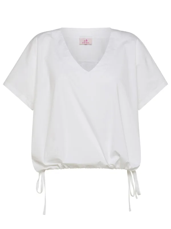 Blouse type: Blouseshirt; Design: Gevoerde zoom/rand, Taille met trekkoord; Materiaal: Katoen; Motief: Effen; Kraag: Zonder kraag; Details: Gedrapeerd; Extra's: Label patch/label flag, Op staal naden; Pasvorm: Normale pasvorm; Armlengte: Kwartmouw; Lengte: Korte pasvorm