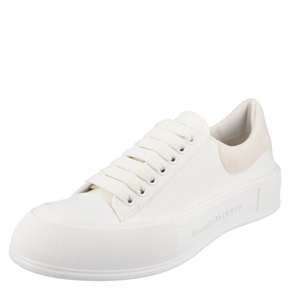 Witte canvas veterschoen Deck Plimsoll met een dikke oversized rubberen zool. De veterschoen is gedetailleerd met een rubberen wikkelzool en een tonale Alexander McQueen-handtekening, afgewerkt met een suède hielkap. Ronde teenvorm silhouet met rubberen teencapsule. Alexander McQueen Deck Lace-Up Plimsoll Oorspronkelijke prijs: EUR 390 Kleur: wit Materiaal: Katoen Staat: nieuw met label Maat: 42 Gebruikssporen: Nee SKU: 49143 / 654594W4MV79000 / 654594W4MV79000_42