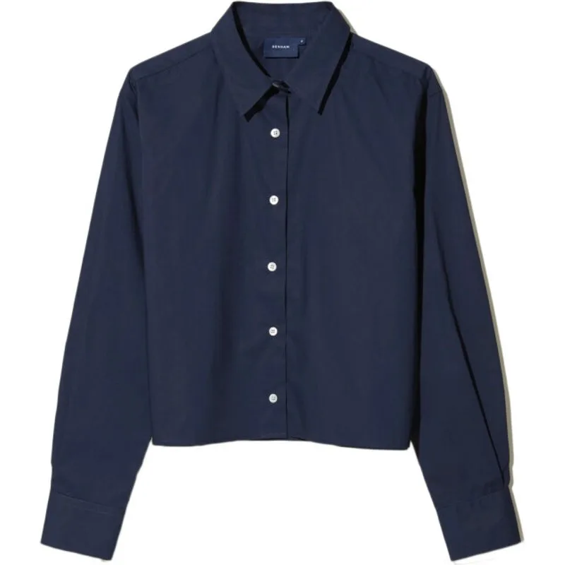De Denham Kiri shirt cropped pop is een donkerblauw katoenen blouse die meteen een nonchalante, zorgeloze uitstraling geeft. Door de ruime pasvorm valt het model losjes over je silhouet en creëert het subtiel volume, terwijl de korte lengte het ontwerp fris en modern houdt. Het poplin katoen voelt licht en ademend aan, waardoor de blouse soepel meebeweegt bij elke stap en toch structuur behoudt. Combineer het met een high-waist jeans voor een speels contrast of draag het los over een jurk voor een relaxte laagjeslook. De lange mouwen en het klassieke overhemddetail geven het geheel net dat beetje scherpte zonder stijf te worden. Dit is een veelzijdig item dat makkelijk schakelt tussen casual en netter, afhankelijk van je styling. Door de ingetogen kleur en zuivere lijnen blijft het een tijdloze aanvulling op je garderobe. Draag het met plezier en een vleugje zelfverzekerdheid.