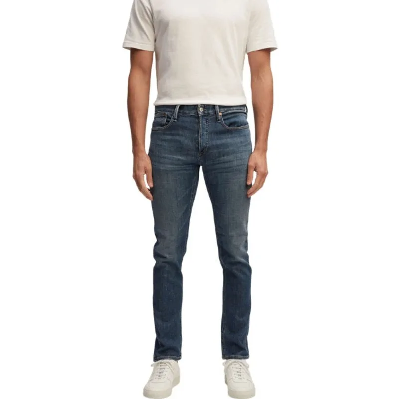 Denham Razor slimfit jeans in midden blauwe used wassing. Razor is de meest populaire jeans van Denham en heeft een normale taille hoogte met knoopsluiting. Dit model zit comfortabel aangesloten op de heupen en bovenbenen met iets taps toelopende pijpen aan de onderkant. Het bekende geborduurde schaartje vindt je op een achterzak.
