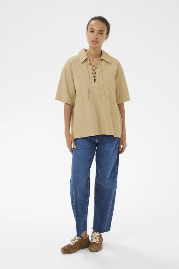 Overhemd met korte mouwen, rechte pasvorm en vetersluiting in de V-hals. Zichtbare naden, grote borstzakken en zachte textuur.