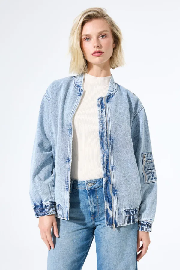 Denim bomberjack met steekzakken. Dit jack heeft een ronde hals, lange mouwen, een ritssluiting en een generous fit. Dit item is gemaakt van 100% katoen. Better Cotton is een initiatief dat zich wereldwijd inzet voor betere omstandigheden in de katoenindustrie.