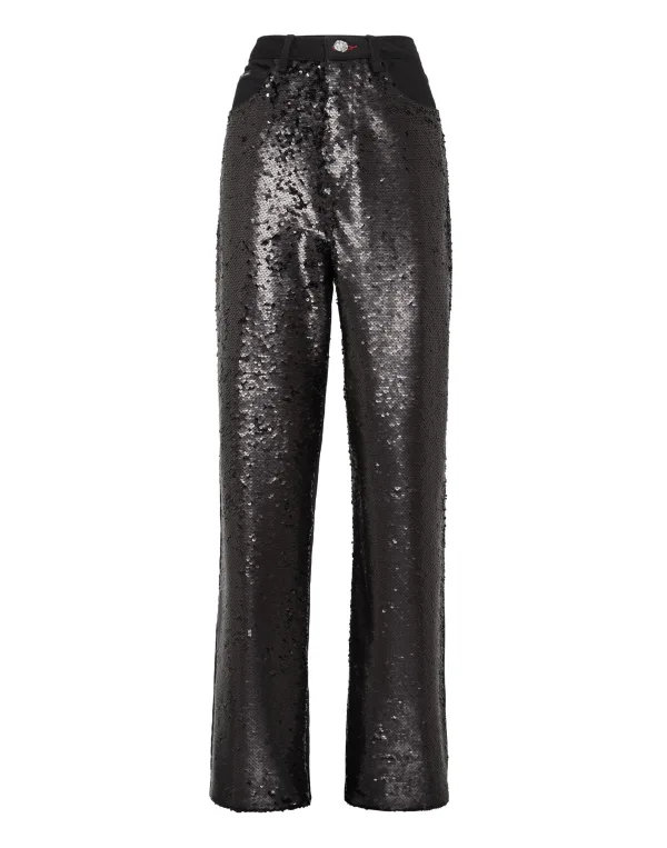 Maak een oogverblindende entree met deze loose fit jeans met paillettenmotief, waar streetwear en pure glamour elkaar ontmoeten. Combineer ze met een minimale top en hakken voor maximale impact. Pailletten all-over voor een schitterend effect Super los silhouet met een ontspannen drapering Zachte katoenen basis met gedeeltelijke voering voor comfort Lederen details zorgen voor een luxe afwerking Gedurfd feeststuk met edgy denim energie