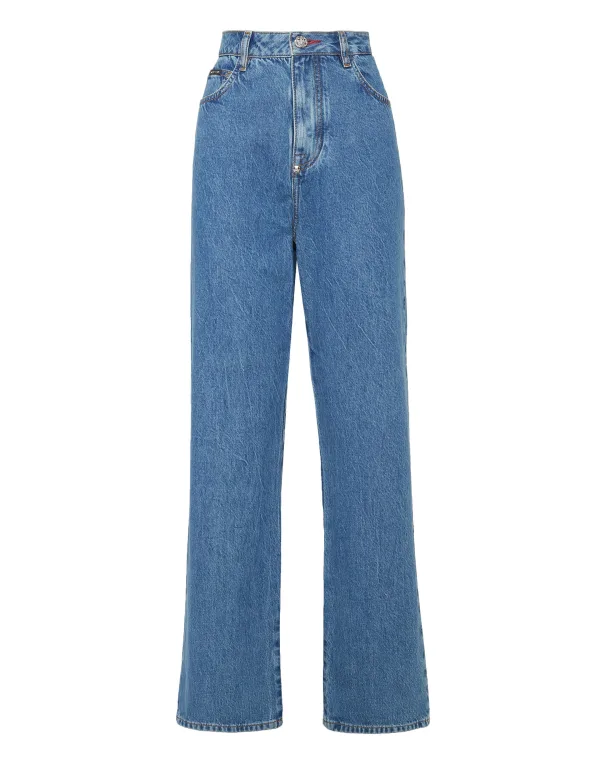 Stone washed denim 5 pocket broek met een badge met logo op de rechter achterzak. Enkele metalen knoopsluiting. Pasvorm: Los.