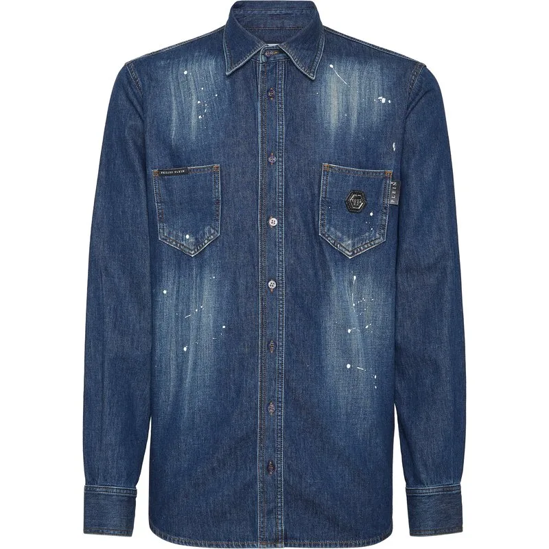 Add a whiff of uniqueness to your look with this denim shirt featuring one of the Brand’s iconic decors. Discover its features. Stone washed denim with wear-and-tear and rips Two patch pockets Skull & Bones patch with raw edges sewn on the back PP Hexagon Logo on a saffian leather patch sewn at left chest Button fastening Curved hem