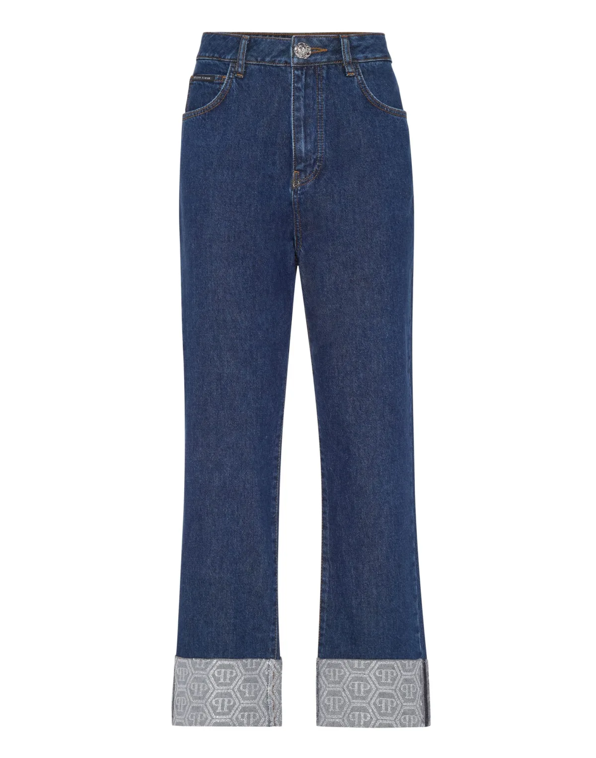 Herdefinieer uw denim collectie met deze luxe loose fit denim broek, prachtig gedetailleerd met monogram manchetten om Philipp Plein's iconische verfijning te belichamen. Premium katoenen denim zorgt voor ontspannen comfort en duurzaamheid. Onderscheidende monogram manchetten voor kenmerkende luxe uitstraling. Los silhouet zorgt voor een fashion-forward, ontspannen elegantie. Moeiteloos te stylen met hakken voor verfijning of sneakers voor casual chic. Belichaamt Philipp Pleins eigentijdse benadering van tijdloze denim.