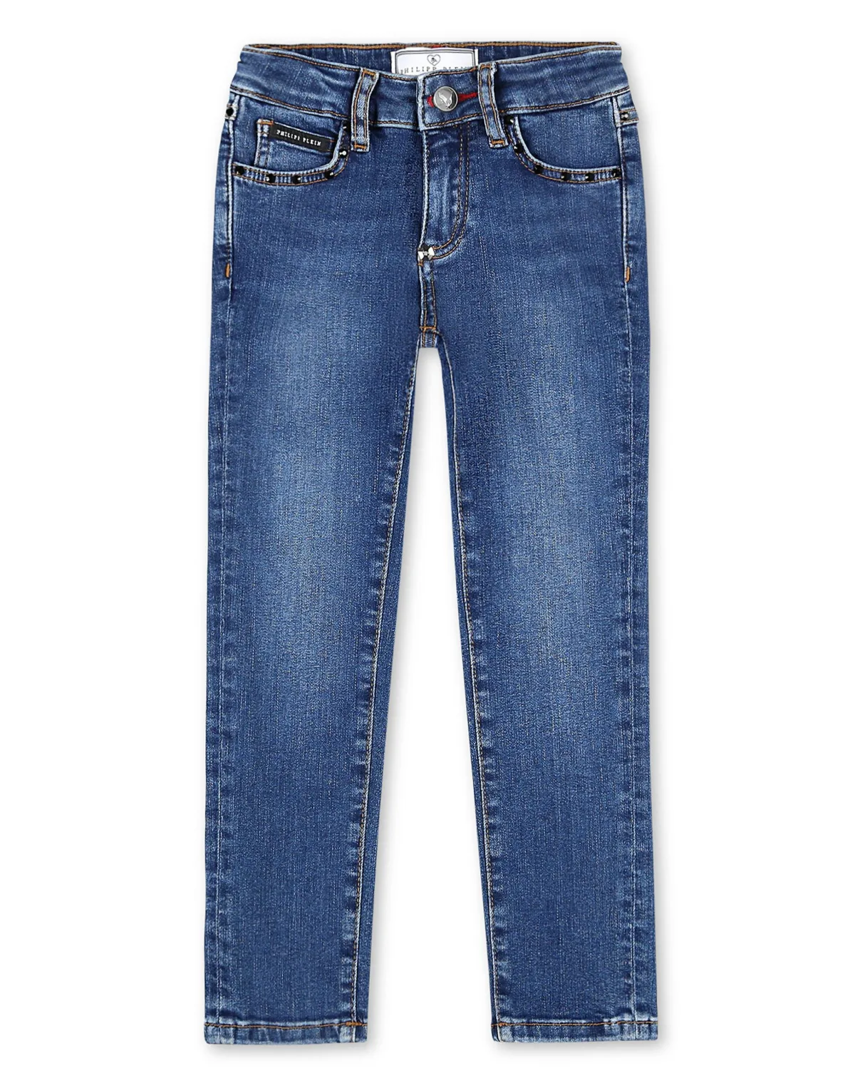 These stretch denim 5 pocket pants are decorated with rhinestone applications on the pockets. The brand's iconic elements are featured on the right rear pocket. Single metal button at waist. Fit: Slim.