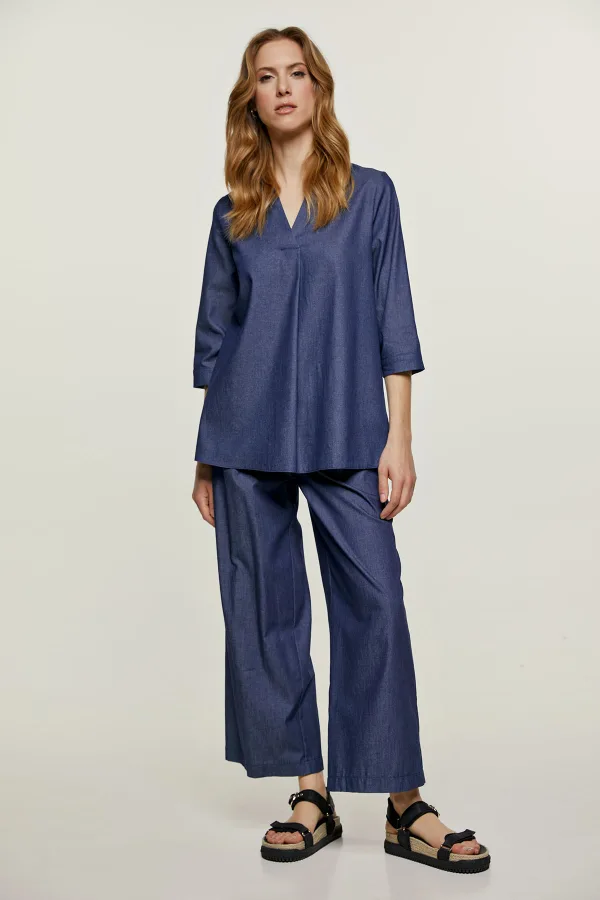 Deze zomerse top is gemaakt van geweven denimachtige stof. Het heeft een kraag met een V-hals en een plooi aan de onderkant. Het heeft ¾ lengte mouwen met manchetten die sluiten met een tone on tone plastic knoop. De top heeft steekzakken aan de binnenkant. Dit kledingstuk heeft een ontspannen, subtiel A-lijn silhouet.